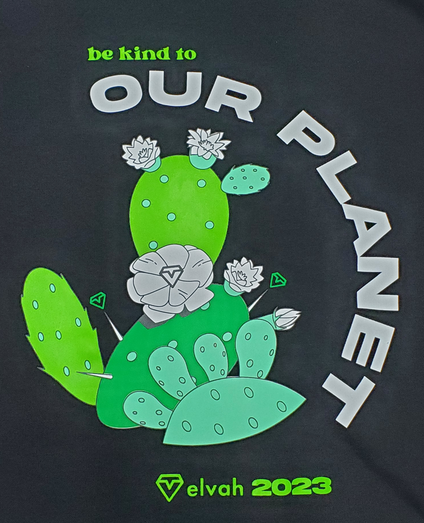 For environmental reasons, we only print with water-based inks. We do not use plastisol or varnish-based inks; we even do not perform the discharge process (etching).
